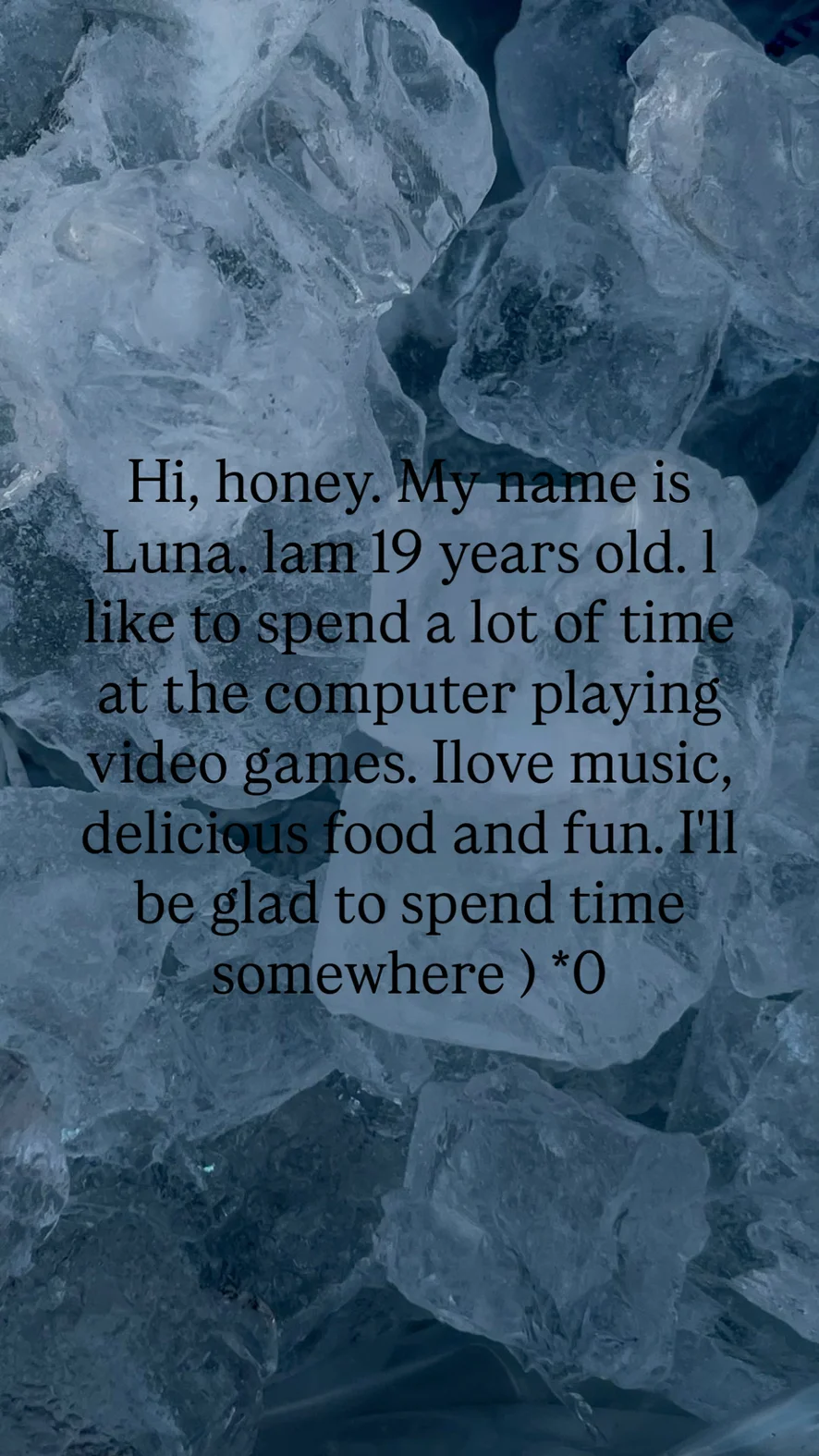 Hi, honey. My name is Luna. I am 19 years old. I like to spend a lot of time at the computer playing video games. I love music, delicious food and fun. I'll be glad to spend time somewhere )❤️🔥🖤