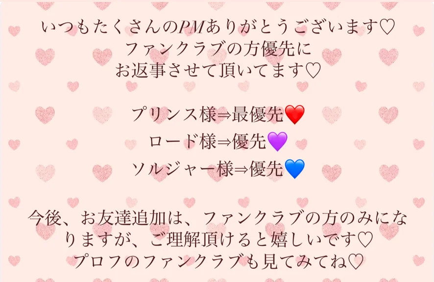 配信始めて ファンクラブ会員になってくてありがと♡ ソルジャー様 プレゼントメニュー10㌫OFF 優先的にPMの返信します♡ ロード様 プレゼントメニュー20㌫OFF 優先的にPMの返信します♡ ファンクラブ様専用のお写真見てください♡ プリンス様 プレゼントメニュー33㌫OFF 最優先でPMの返信します♡ ファンクラブ様専用のお写真見てください♡♡ プリンス様専用の動画見てください♡ みんなで内容作っていきたいので どんなのがいいかコメントで、教えてね🫶 ファンクラブに入ってくれたら プレゼントメニューがお得にになってます🫶 ファンクラブ会員様限定で お写真などアップさせていただきます💓 みんなありがとう💓 大好き♥️