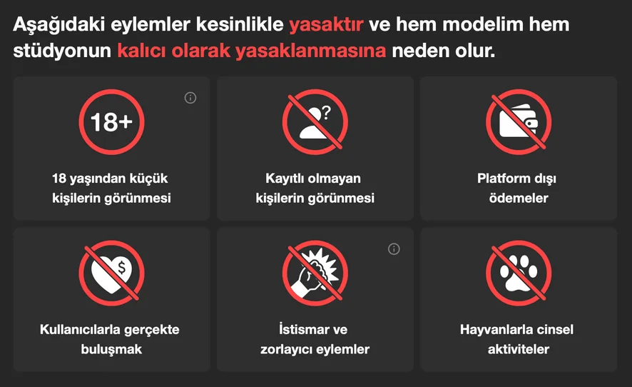 1- Bu odadaki herkese saygı göster ve kaba olma. Burası bir aşk köşesi, nefret köşesi değil. 2- Tatlı dil kullan ve iyi kelimeler seç. 3- Irkçılık yapma. 4- Reklam yapma. 5- Spam yapma. 6- Yapmak istemediğim şeyler hakkında beni zorlama ve seçimlerime saygı göster. 7- Token göndermeden özel taleplerde bulunma. 8- Rahatla ve şovumun tadını çıkar.